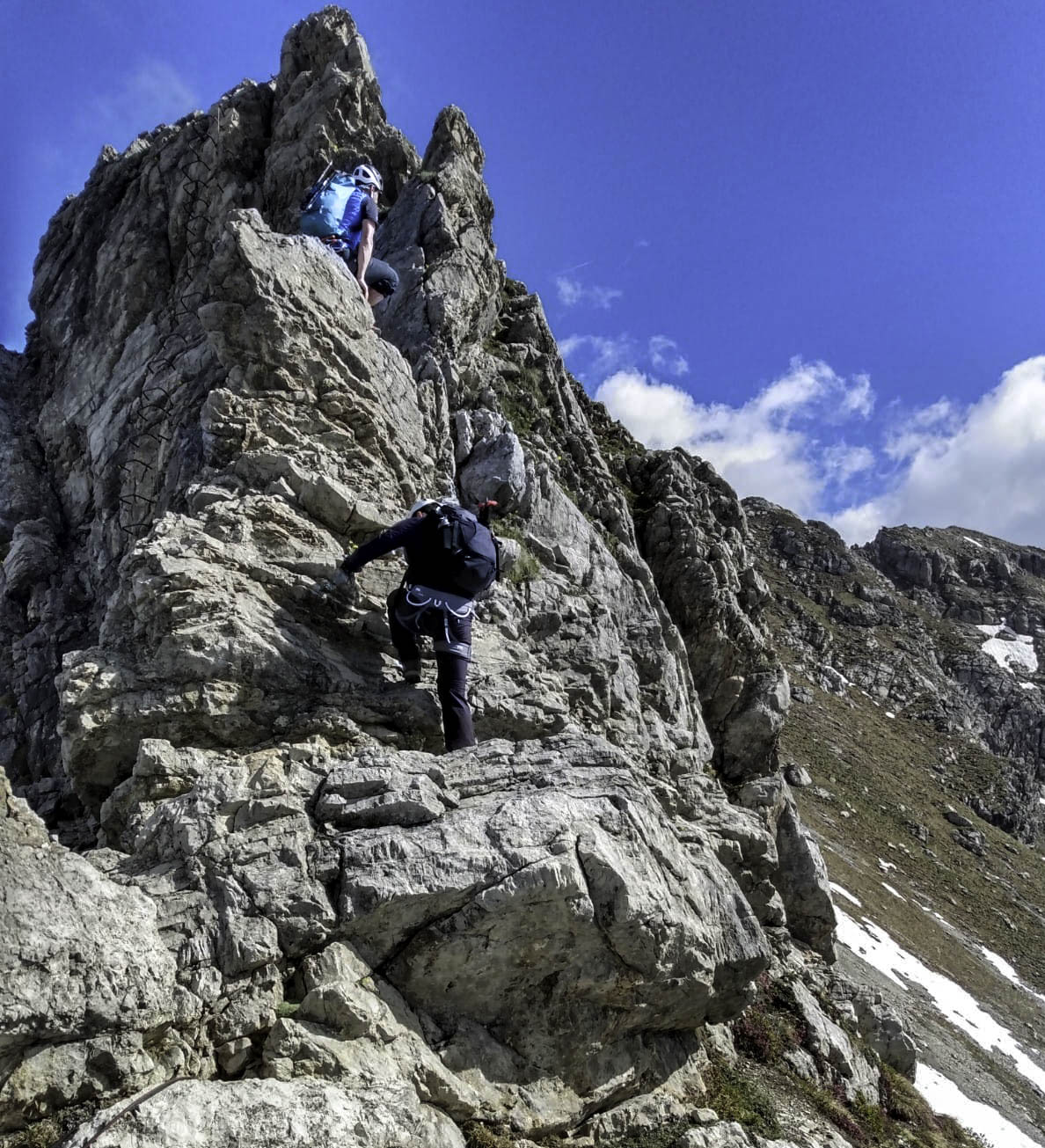 The second photo shows the destination for their second day and second via ferrata - the ridge behind Andy.