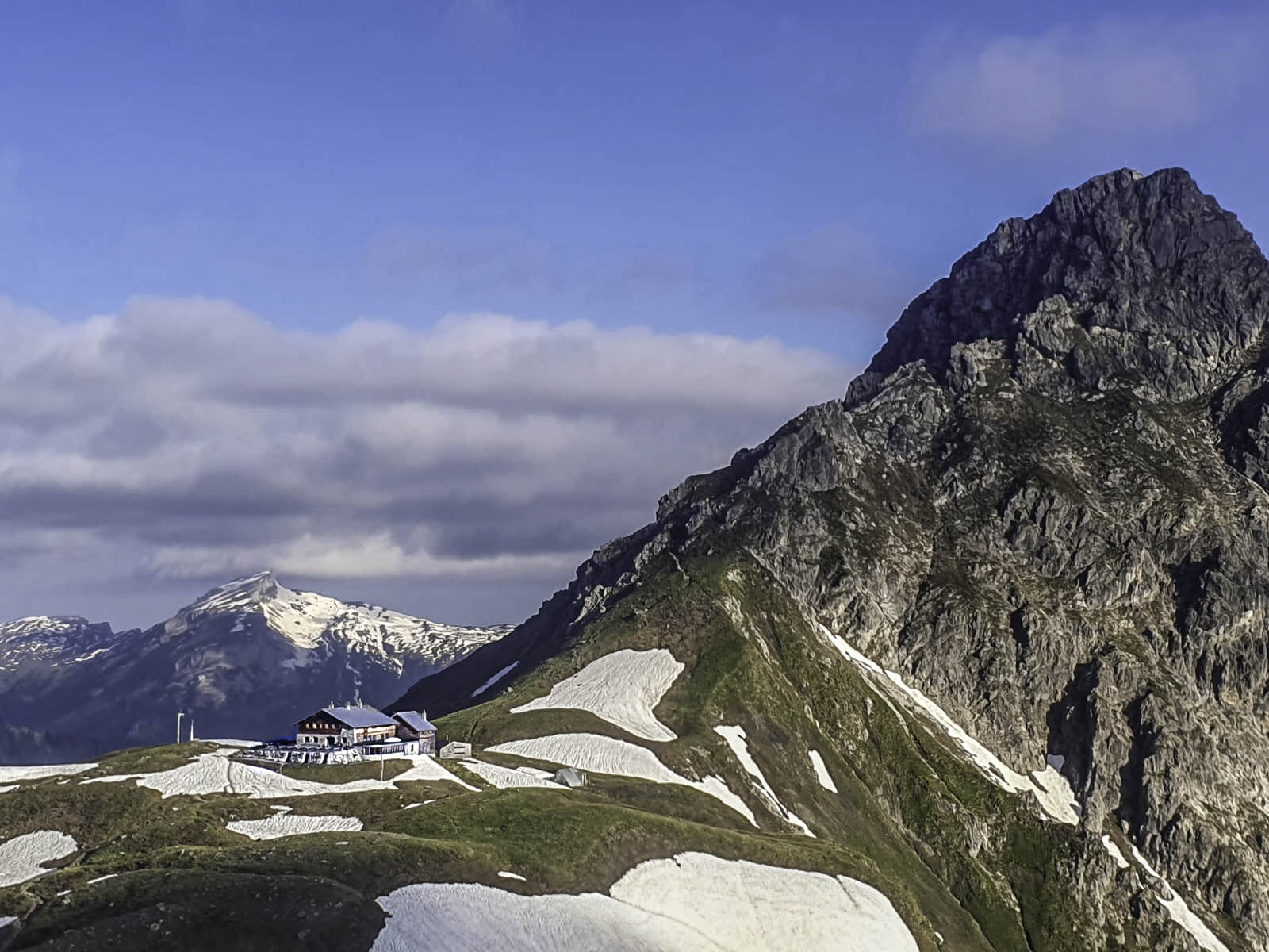 They started near the city of Obertsdorf, Germany, where they took a chair lift up into the mountains. On the first day, they crossed into Austria, climbing a ridge and peak along the way, to reach the hut which would be their home base at an altitide of 6500 feet (2000 meters). Their hut is visible in the photo on the left.