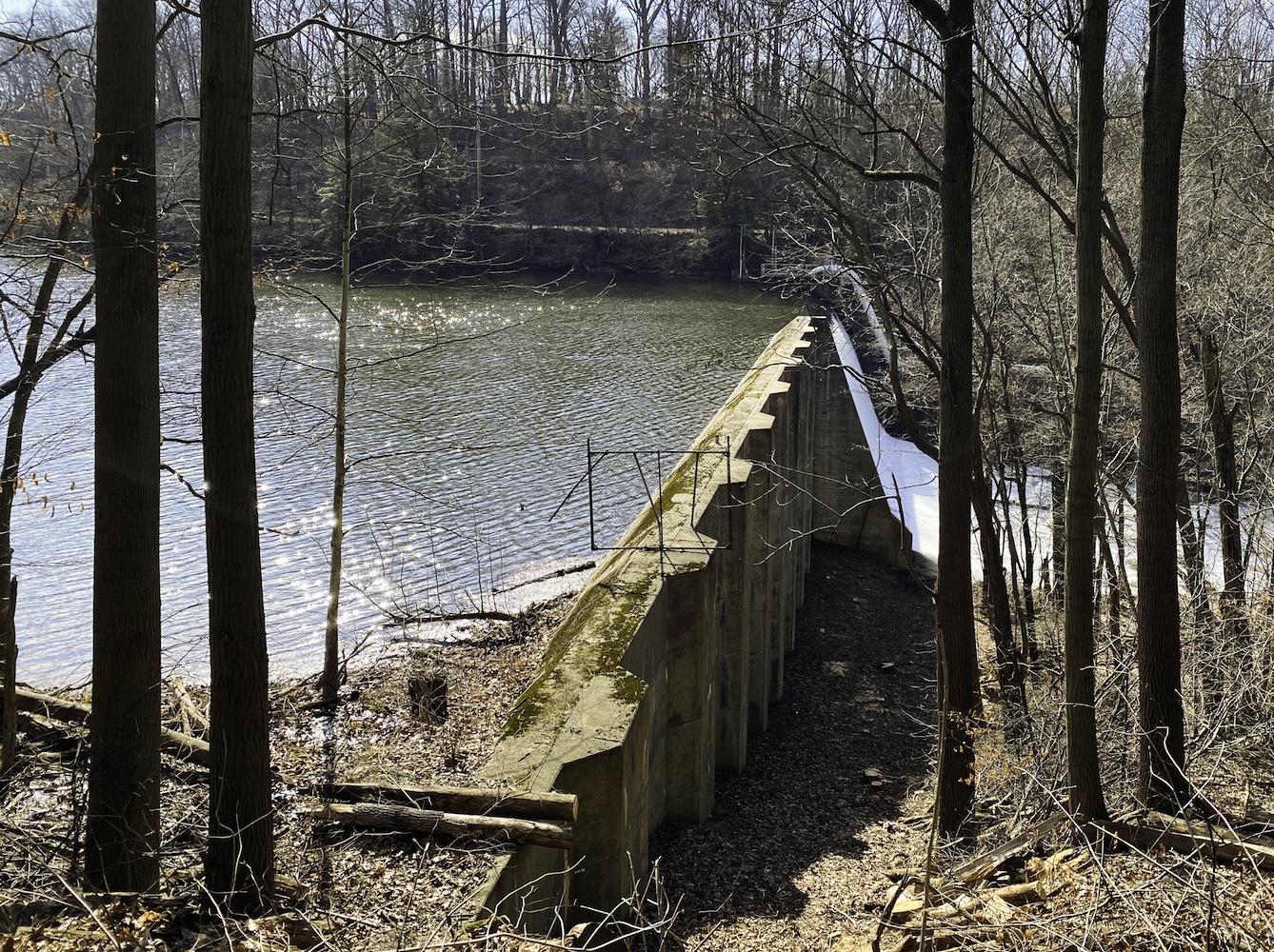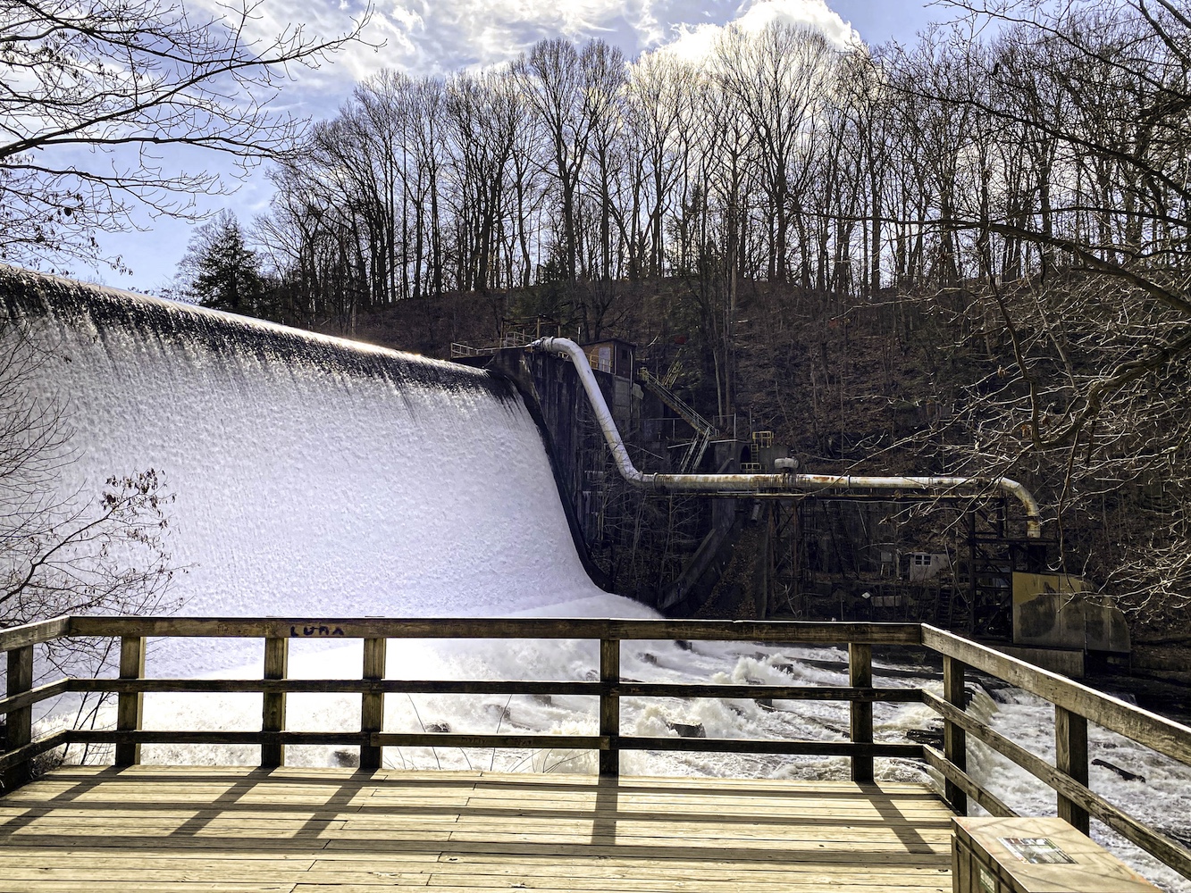 An electric powerplant was built here in 1912, with the dam to provide necessary power. The plant was dismantled in 1958, while the dam remained no longer in use.