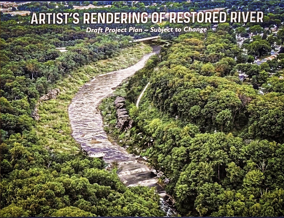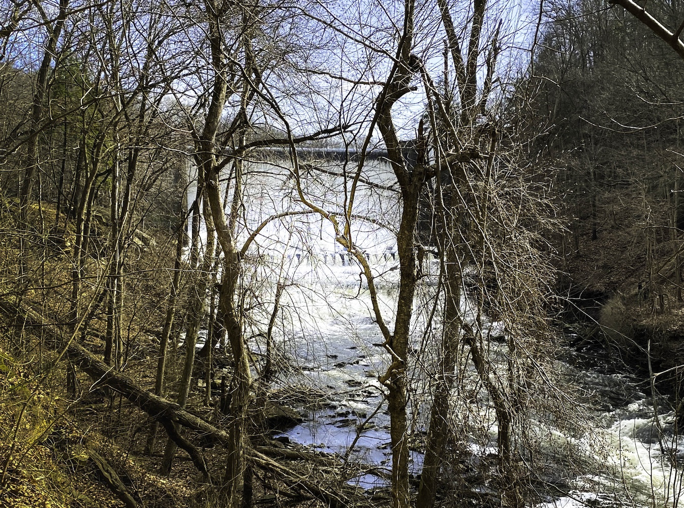 The photo above left shows the Cuyahoga River approaching the current dam and spillway. On the right you can see what that part of the river used to look like. The rock ledges, now under water, created what was called "Big Falls." To get a sense of how big "Big Falls" were, note the man standing in the lower right corner.