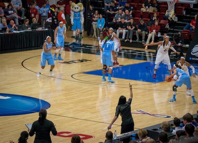 while Rameses, the UNC mascot, looks on from the opposite corner