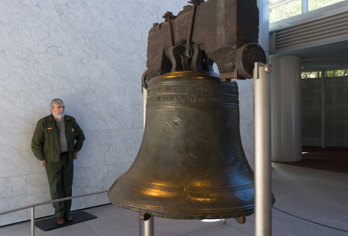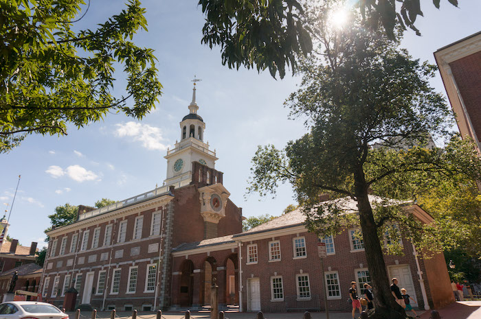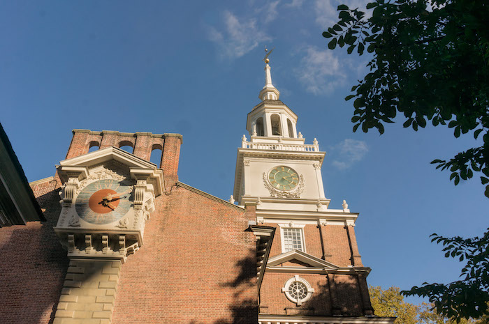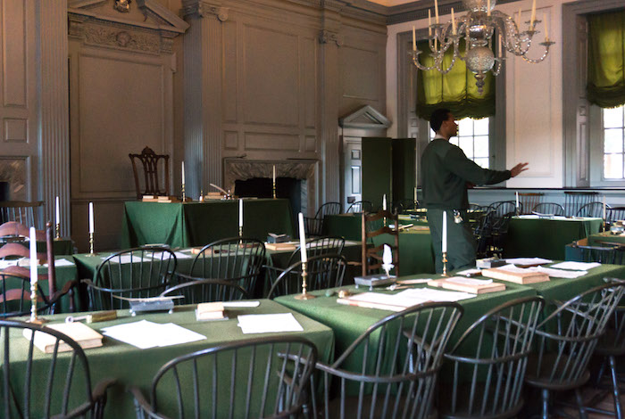 This is Independence Hall in Philadelphia. Inside is the room where the Declaration of Independence was signed, and the US Constitution was debated and adopted, below left. The guide is explaining that this is "the room where it happened."