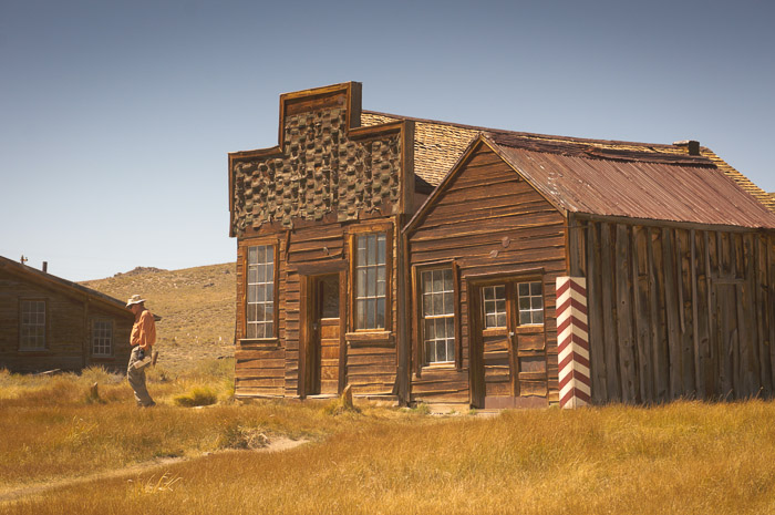 The building on the right, with the red and white post, is the Barber Shop. Next to it is the Sam Leon Bar, one of Bodie's 65 saloons.