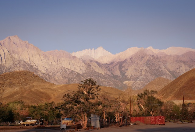 I got up early on Sunday morning, September 8, and took this picture of Mount Whitney from behind our motel. Whitney, the tallest point in the contiguous United States at 14,505 feet (give or take a few feet, as we learned at the local diner), is the lighter colored peak in the center of the photo.