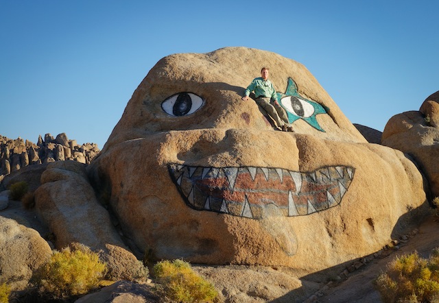 This is Brenda, also known as Face Rock -- she's easy to spot as you drive into the Alabama Hills. Local citizens have been freshening her makeup for decades, and Mike has visited her several times. He has a picture of himself sitting along her nose from every visit, and we added this one to his collection. Mike and his friend Paul Mazaika visited Brenda in May, 2013.